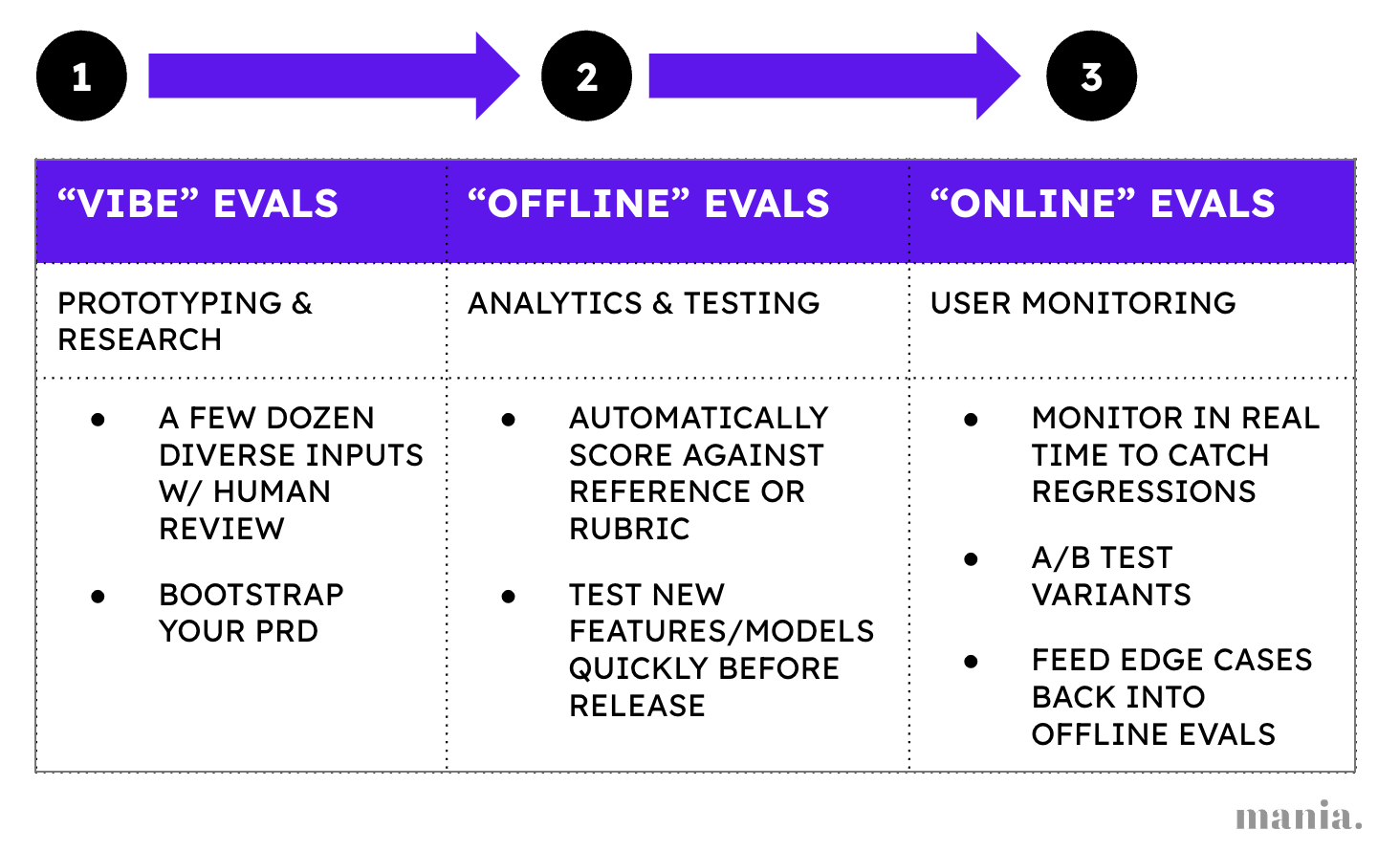 Evals can take many different forms, each suited to different stages of the product life cycle - from systematic human vibe checks to autonomous user monitoring.