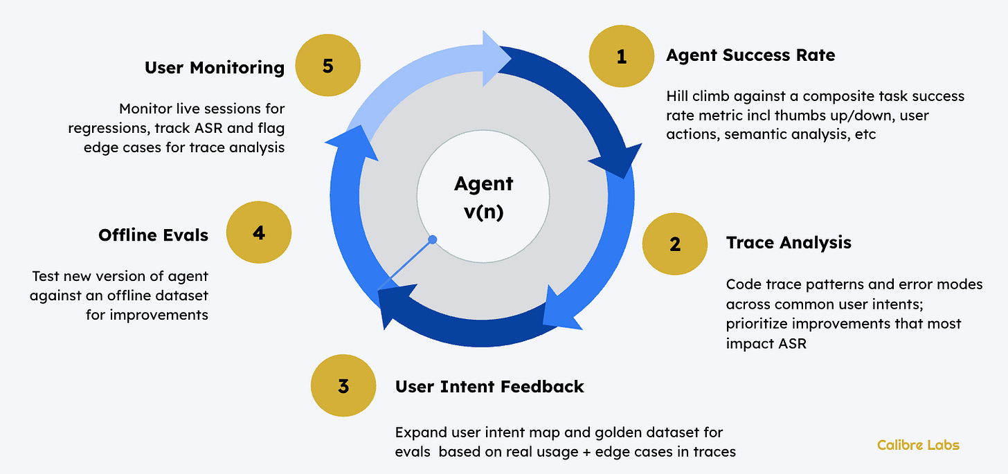 Real world AI usage is messy and often surprising for new features. Nothing can replace actual monitoring and (anonymized) semantic analysis of user sessions to make sure your agent is working in the wild. This observability layer should drive how you track Agent Success Rate, closing the loop on our AI Flywheel.