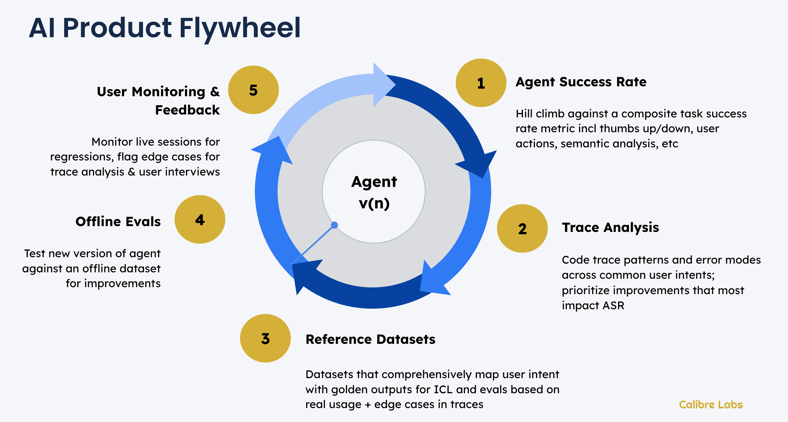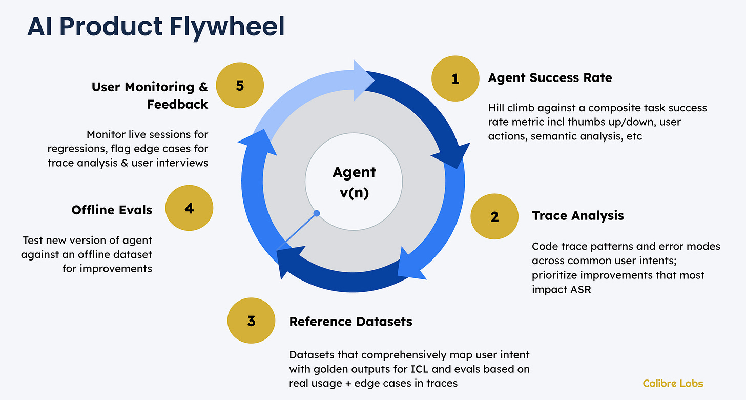 Regular roadmapping and product review processes don’t translate well to agents. AI product teams need to build a flywheel system to hill climb against a new kind of north star metric - agent success rate.